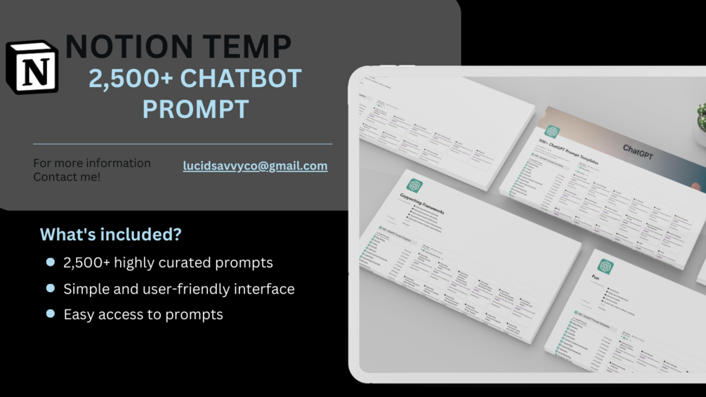 2,500+ AI Chatbot Prompt Templates is a comprehensive collection of highly curated prompts that are tailored to many common and specific needs. With this product, you can easily access a wide range of prompts for ChatGPT & Notion Ai and enhance your productivity.